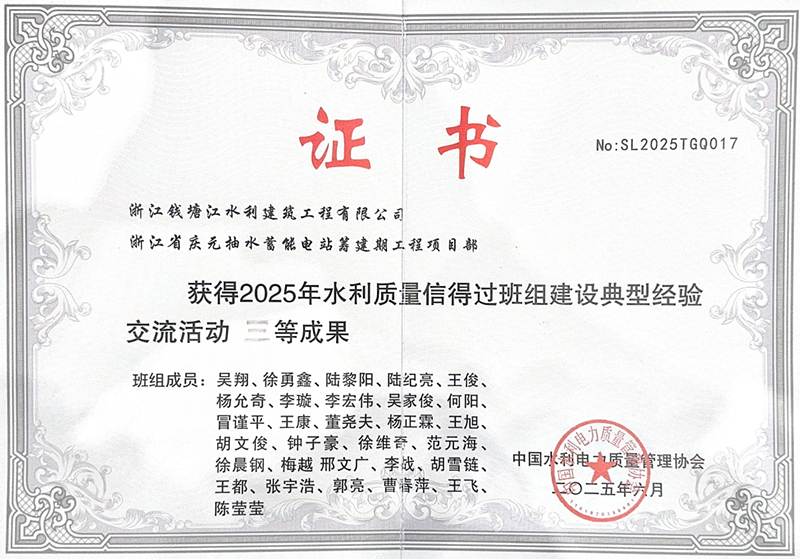 近日,中國水利電力質(zhì)量管理協(xié)會(huì)公布2025年度水利質(zhì)量信得過班組建設(shè)典型經(jīng)驗(yàn)交流活動(dòng)評(píng)選結(jié)果,慶元抽蓄籌建期EPC總承包項(xiàng)目憑借扎實(shí)有效的質(zhì)量管理實(shí)踐和突出的建設(shè)成果,榮獲“2025年水利質(zhì)量信得過班組建設(shè)典型經(jīng)驗(yàn)交流活動(dòng)”三等成果。這一榮譽(yù)不僅為“浙錢水建”品牌再添光彩,更標(biāo)志著公司在工程質(zhì)量管理領(lǐng)域獲得了行業(yè)權(quán)威機(jī)構(gòu)的高度認(rèn)可。